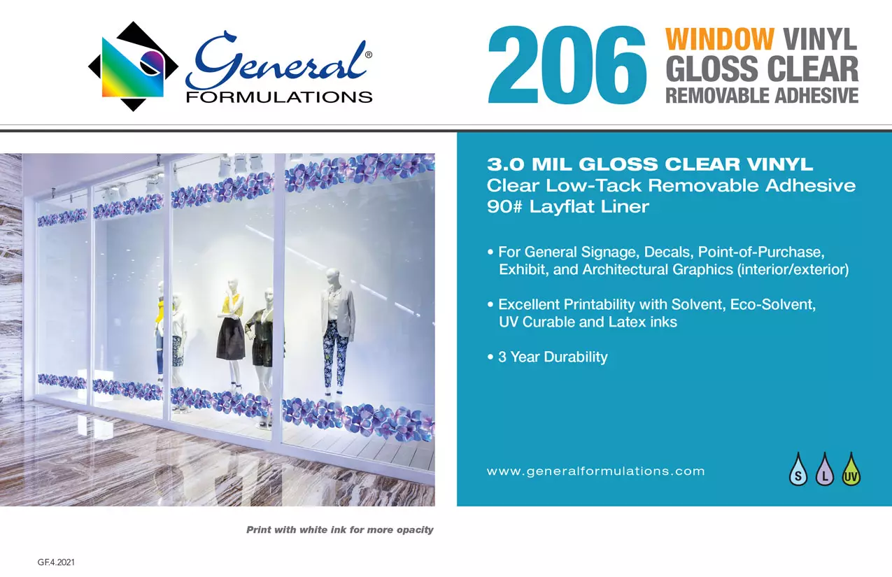 GF 206 is a 3.0 mil gloss clear vinyl with a clear low-tack removable acrylic pressure sensitive adhesive on a 90# layflat liner.