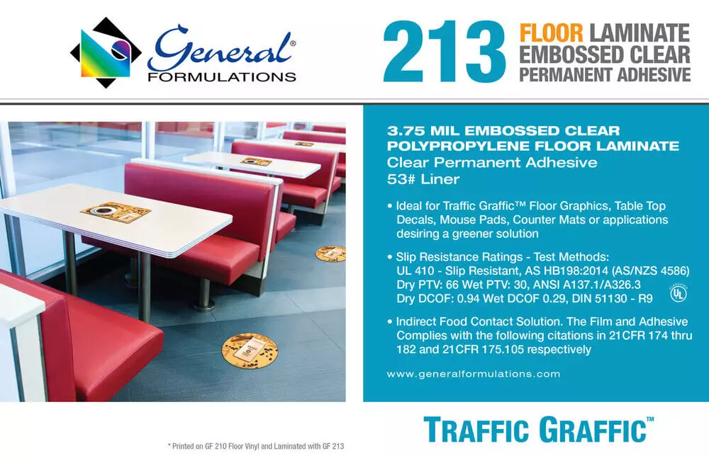 GF 213 is a 3.75 mil clear embossed polypropylene film designed for use as an economical protective laminate for TrafficnGraffic® decals. This non-glare laminate is also an environmentally friendly alternative to vinyl films. GF 213 laminate offers anpermanent acrylic pressure sensitive adhesive formulated for exceptional clarity and bond for printed graphic applications.nIt is intended for use as a laminating film for producing short term indoor Traffic Graffic™ floor decals, table and counter topnapplications. GF 213 is also approved for indirect food contact. The adhesive is formulated to adhere to most common printingninks. GF 213 has been rated for slip resistance based on multiple testing methods.