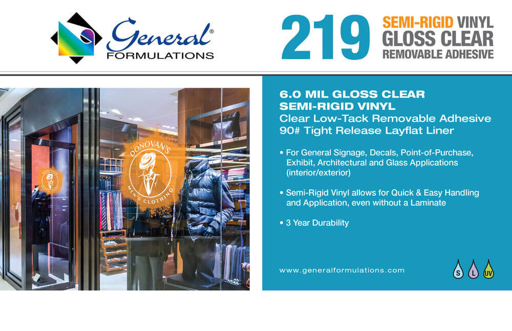 GF 219 is a 6.0 mil gloss clear semi-rigid vinyl with a clear low-tack removable acrylic pressure sensitive adhesive on a 90# liner