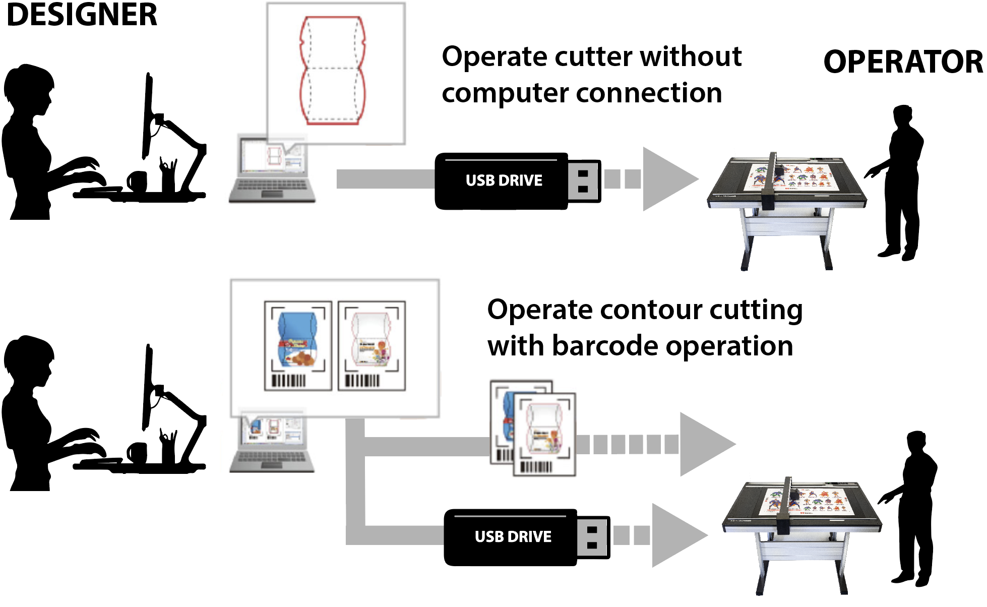 When performing contour cutting, also known as “Print & Cut”, the cutting data is automatically selected from the prepared USB flash memory. The FCX4000 scans the bar code printed on the media then automatically performs the contour cutting job. This emerging method helps to prevent operator error of using incorrect data – thus improving workflow efficiency.