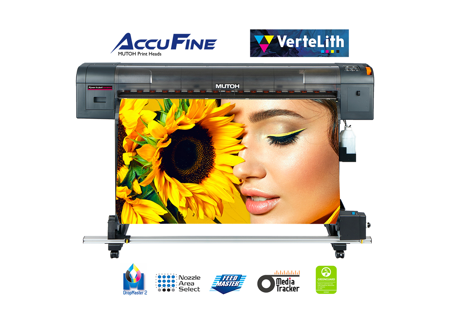 The MUTOH XpertJet 1341SR Pro 54″ Eco-Solvent printer, with it’s small footprint and high-quality output, is ideally-suited for the production of vibrant graphics and signage. It is powered by MUTOH’s new genuine VerteLith™ RIP Software, bundled with FlexiDESIGNER MUTOH Edition 21, a $2,199.00 value. VerteLith RIP optimizes all of the capabilities the XPJ-1341SR Pro has to offer and produces the best-possible gradients, skin tones and vivid colors. This printer features MUTOH’s new AccuFine Print Head, which achieves best-in-class dot placement accuracy and an increased nozzle row length for higher productivity. Also included with the XPJ-1341SR Pro is i-screen optimizing technology, which reduces banding to create smoother looking images. Automated processes like Nozzle Area Select, Feed Master, DropMaster2 and Media Tracker make this printer an excellent choice when looking for an entry-level, roll-to-roll machine that balances performance and cost.